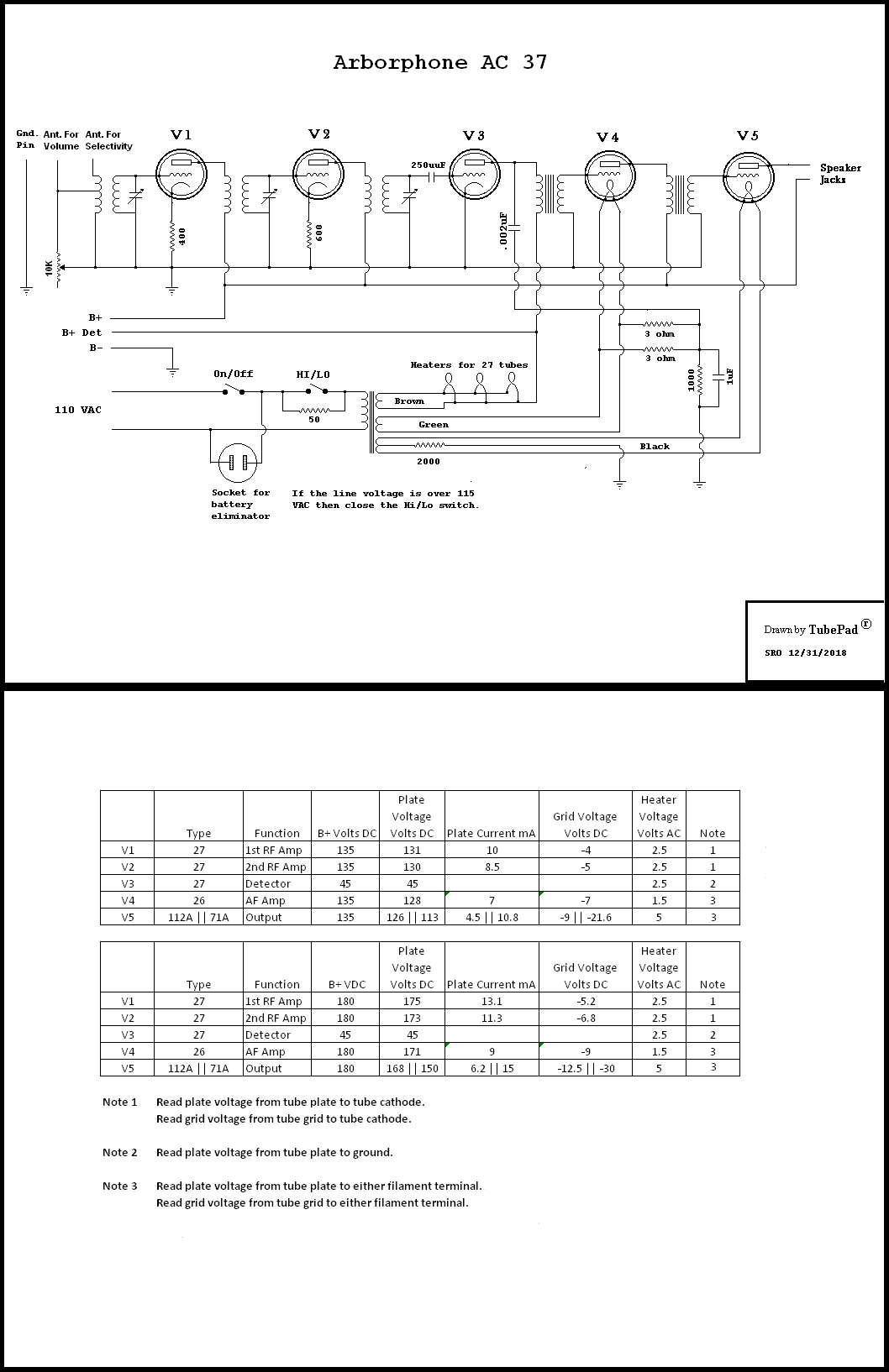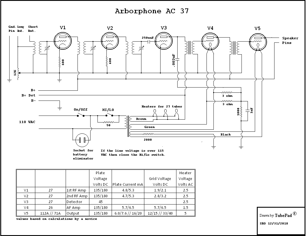 I have another Arborphone AC 37 and that one is a little different.  The instruction card in that radio says the final output tube to use is a 26.  That suggests B voltage ranges are different as well. Using a 26 instead of a 71A as my radio uses means there probably is not a 5 volt filiament circuit in this other radio and the schematic shown above would not apply.