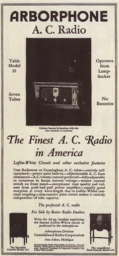 The ad boasts of the Loftin-White circuit and at first I assumed it would be the same circuit used in the Arborphone 37-AC and 55. However those two radios use an 8 tube circuit while this ad claims a 7 tube circuit for the 35 model. The ad also states that the 35 model is available in a variety of cabinet and console styles. Other than the early Arborphone, the front panel dimensions are the same throughout the Arborphone product line, at least on the subset of Arborphone radios that I have collected.